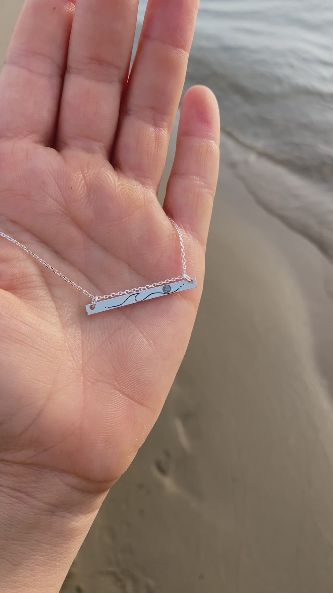 Collar con aguamarita facetada calidad AAA+ montada en lingote, el collar es reversible, el un lado aparece el grabado de una ola y el aguamarina y por el otro la inscripción a(mar). Hecho a mano en Plata de Ley.