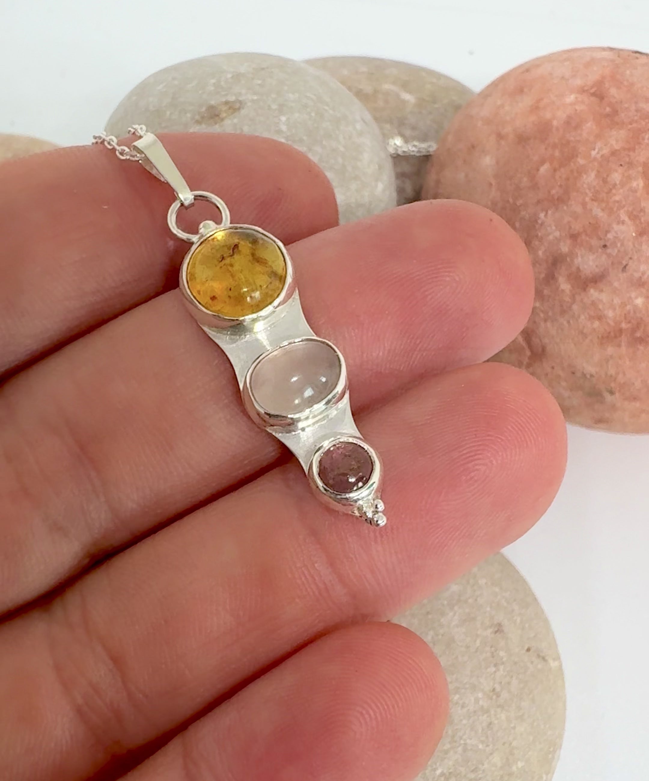 Collar hecho a mano en plata de Ley con Ámbar, cuarzo rosa y turmalina rosa