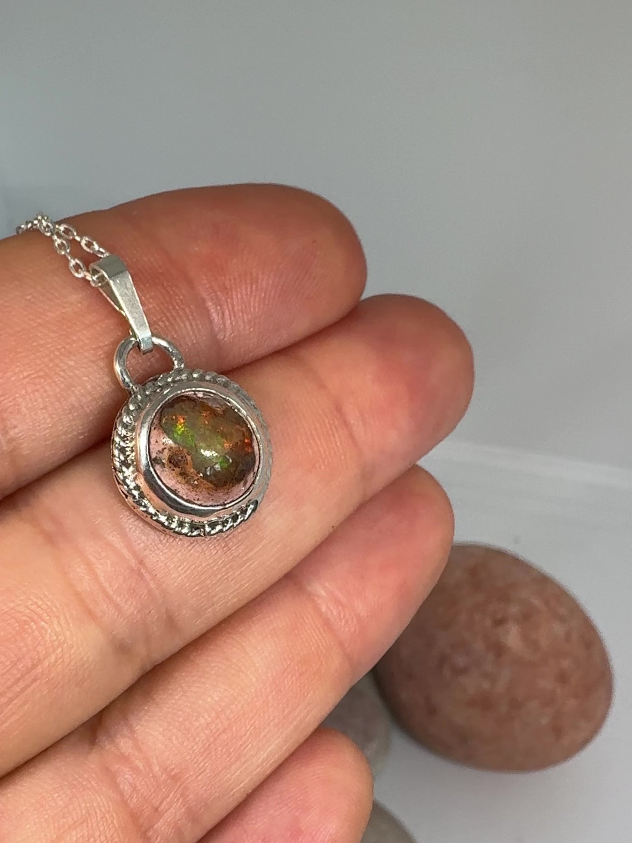 Collar hecho a mano en plata de Ley con ópalo de fuego méxicano y pieza de luna trasera.